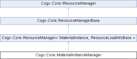 Public Member Functions inherited from Cogs::Core::ResourceManager< MaterialInstance, ResourceLoadInfoBase > | |