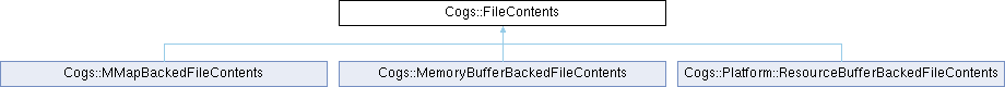 Implemented in Cogs::Platform::ResourceBufferBackedFileContents, Cogs::MemoryBufferBackedFileContents, and Cogs::MMapBackedFileContents.